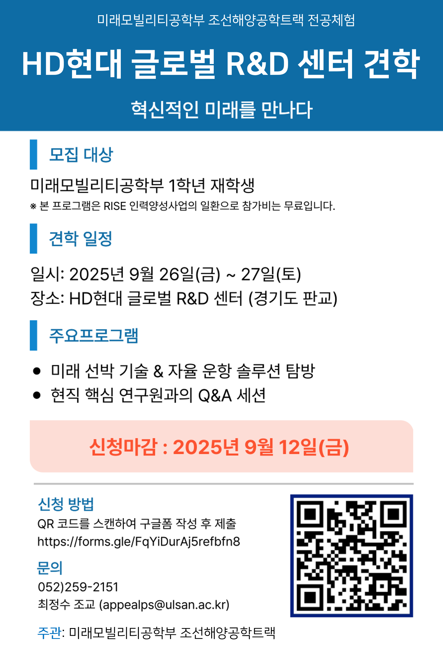 울산대학교 조선해양공학트랙에서는 1학년 신입생들과 함께 HD현대 글로벌R&D센터로 전공체험 투어를 떠납니다. 첨단 연구환경을 갖춘 HD현대 글로벌R&D센터에서 조선해양산업의 미래를 체험해 보기 바랍니다. 관심 있는 1학년 학생들의 많은 신청 바랍니다.
